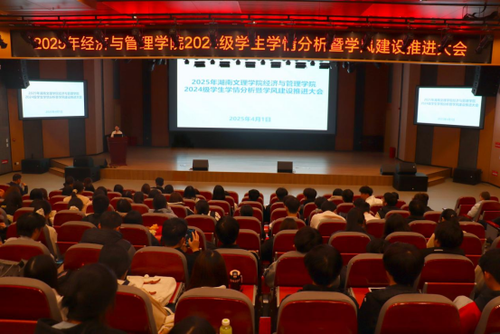 为营造良好的学习氛围,推动学院学风建设迈向新台阶,4月1日19:00,经济与管理学院在大学城校区图书馆报告厅召开了2024级学生学情分析暨学风建设推进大会。学院党委书记王良波、学院院长贾先文、学工办主任聂紫彤、24级辅导员朱酸、戴晨曦及2024级全体学生共同参与本次会议。会议由学工办主任聂紫彤主持。