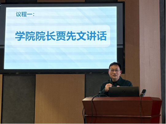 学院院长贾先文首先对同学们致以诚挚问候。他指出,学校始终秉持"以生为本"的育人理念,为大家提供了良好的学习与生活环境。本科一年级是构建知识体系的关键奠基期,务必要珍惜时光,扎实学好基础知识,为未来的学业和职业发展筑牢根基。