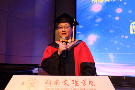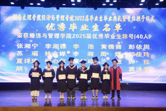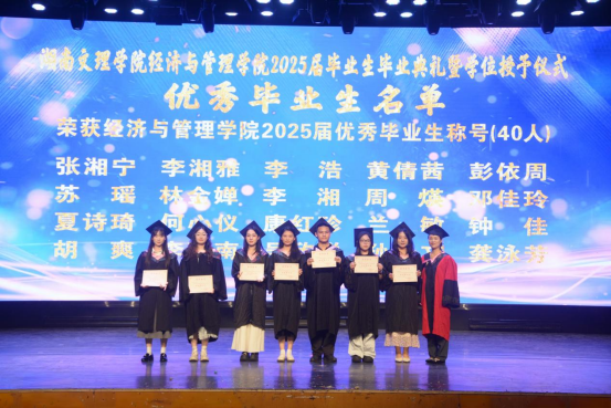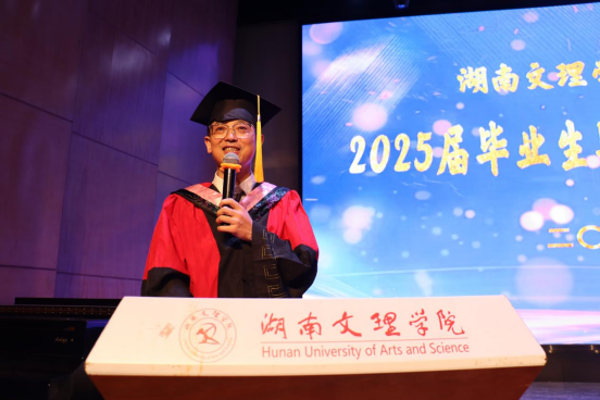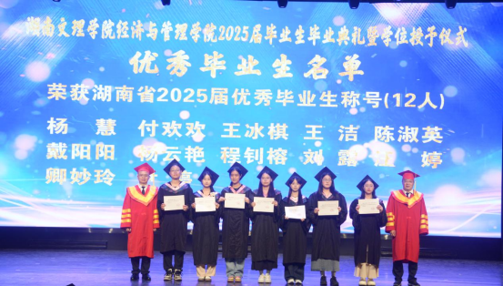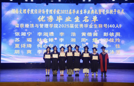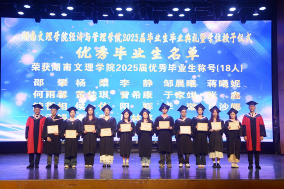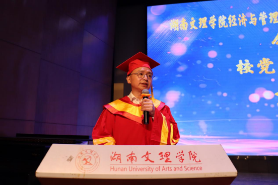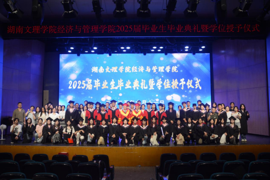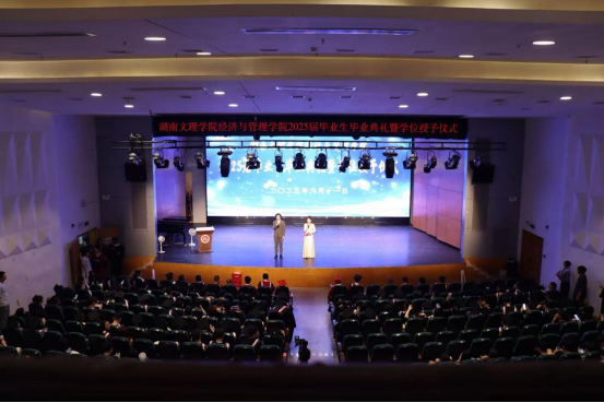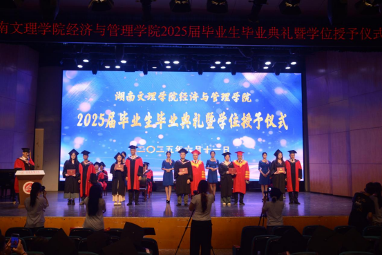 20256119:30,湖南文理学院经济与管理学院2025届毕业生毕业典礼暨学位授予仪式在音乐厅举行学校党委委员、副校长刘春晖,副校长肖小勇,学校正处级干部、委派湖南应用技术学院党委书记、督导专员乔臣,学院党委书记王良波,院长贾先文,党委副书记杨腾,副院长何鑫祁飞,国际经济与贸易系主任、教工第一党支部书记沈启超,工商管理系主任刘智勇,金融工程系主任王尔媚,教师代表,学工办全体辅导员,主礼与观礼老师,学院校友代表04级国际经济与贸易专业蔡佳,毕业生代表和在校生代表齐聚一堂,共同见证这一庄重而温暖的时刻。本次仪式由学院党委书记王良波主持。