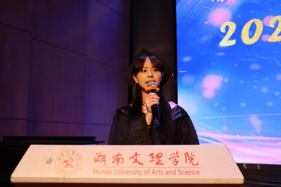 毕业生代表21级市场营销专业毕业生代表王洁细数四年点滴,坦言母校不仅是滋养成长的土地,更教会自己面对不确定时的自信从容从学科竞赛中探索自我,在志愿服务中感悟责任,到复试现场与面试官从容对答,每一段经历都拼凑成独一无二的大学时光。她向同窗送上甜蜜祝福大家带着博学弘文、明理求真的校训,让经世济民、管己达人的理念永远盛放