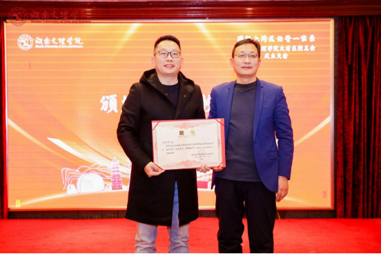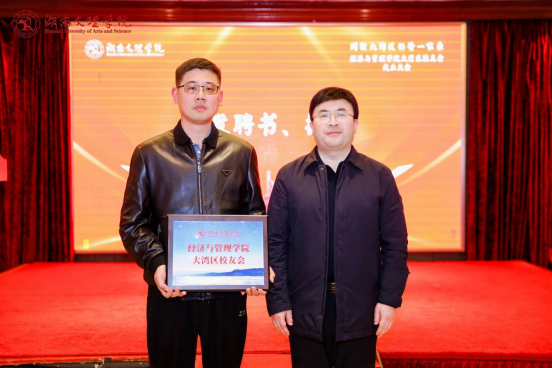 学校校友总会秘书长万力为经济与管理学院大湾区校友会授牌,经济与管理学院院长贾先文为当选的理事会成员颁发聘书。