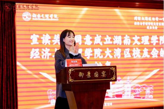经济与管理学院党委副书记杨腾宣读关于同意成立湖南文理学院经济与管理学院大湾区校友会的批复。经济与管理学院大湾区校友会第一届理事会筹备组负责人就《湖南文理学院经济与管理学院大湾区校友会章程》和组织架构及拟任人选作情况说明。大会审议并通过了《湖南文理学院经济与管理学院大湾区校友会章程》和第一届理事会名单。选举2004级国际经济与贸易专业中山校友朱志深为会长,2004级国际经济与贸易专业中山校友曾良为监事长,2006级市场营销专业深圳校友周承耘为秘书长。
